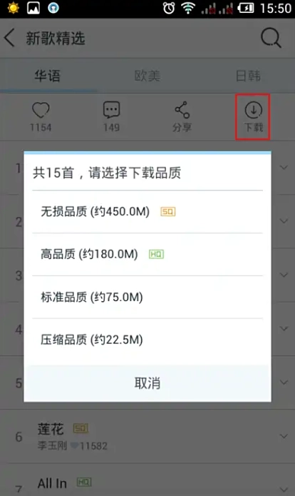如果需要批量歌曲,那么可以在歌曲列表的页面上方点击【】,同样选择歌曲品质即可。