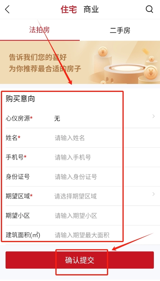 3 、在购房意向页面填写相关信息,确认无误后点击底部 “提交” 按钮即可。