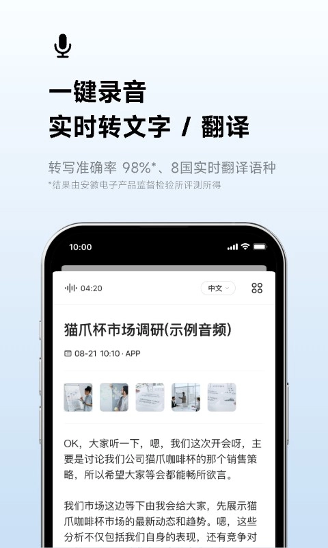 ①录音实时转文字:准确率98%*,13种语言自由转写*。