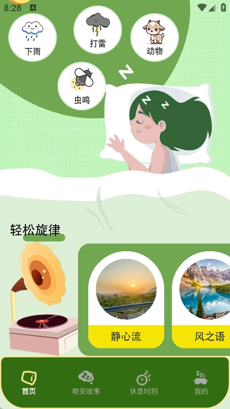 首页设有助眠轻音乐,也提供不同旋律的音乐供用户了解。