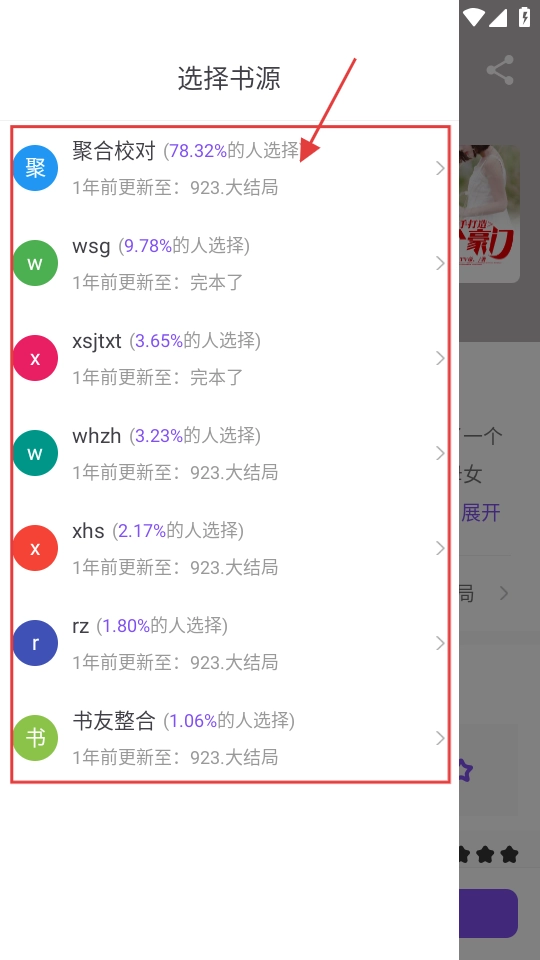 2、阅读前会进入【选择书源】页面,选一个合适的书源,就能开始看啦。