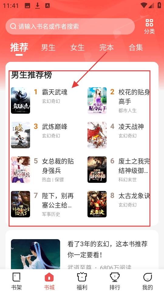 1、在书城推荐板块的男生推荐榜上,能看到《霸天武魂》这类热门小说,点击该小说即可进入详情页面,开启您的阅读之旅。