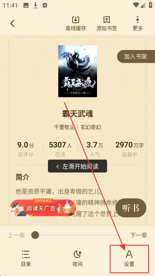 2、进入小说详情页后,底部有【设置】按钮,点击它可进入设置界面,调整阅读相关参数啦。