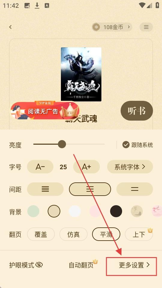 3、在设置界面,点击【更多设置】按钮,可进入更多设置页面,查看并调整更多阅读选项哦。