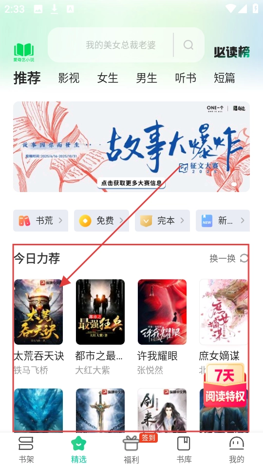在爱奇艺小说的精选页面设有“今日力荐”板块,选择你感兴趣的小说点击,即可进入该小说的详情页面。