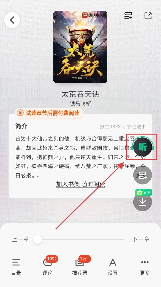 3、阅读小说时,若想切换成听书模式,点击界面中的“听”按钮,就能开启听书啦。