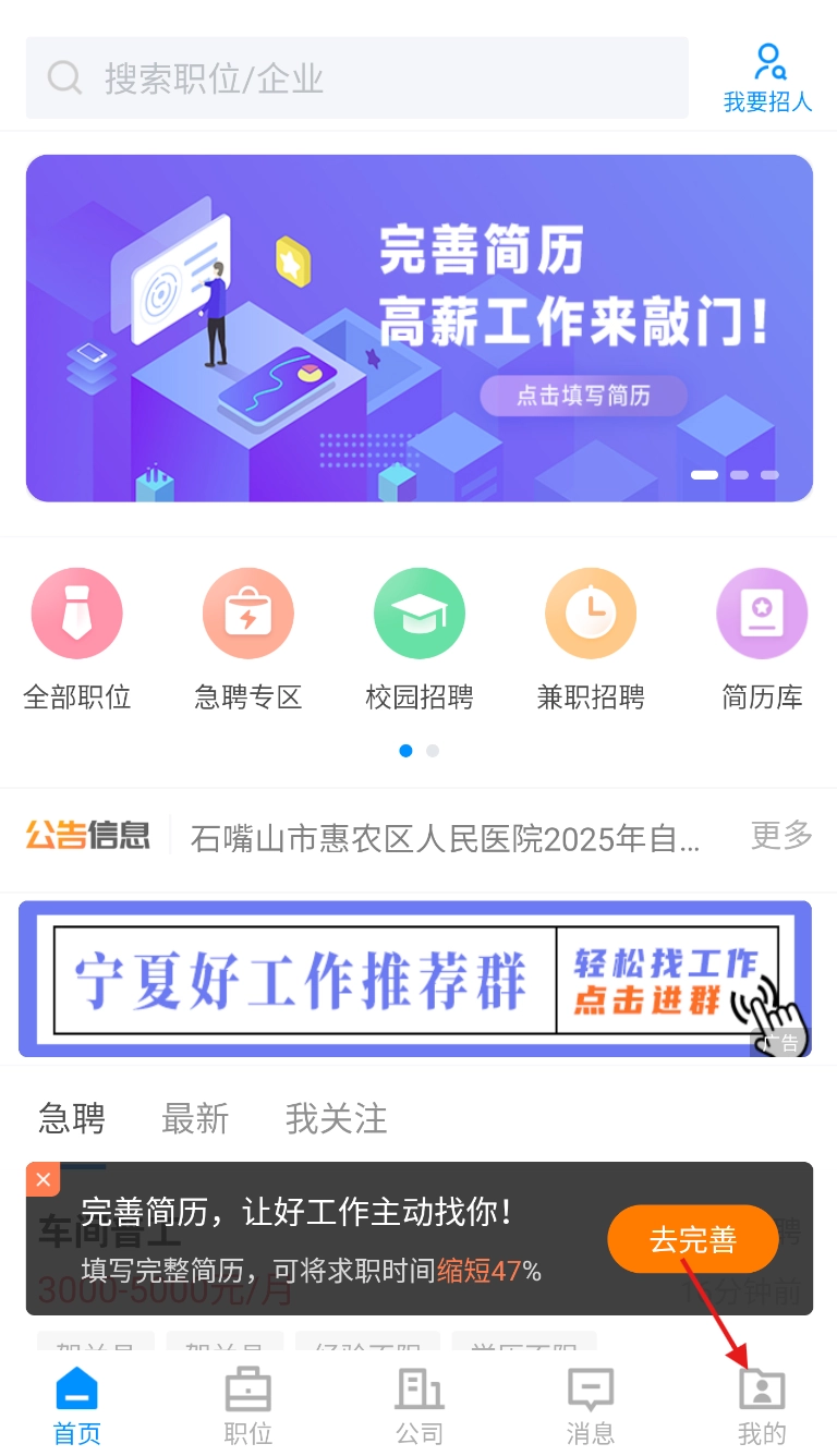 1、打开宁夏招聘APP进入首页后,轻点页面底部的“我的”选项,即可跳转至个人专属界面。
