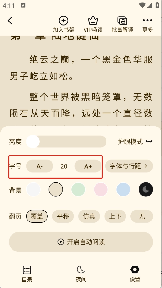 1、进入小说阅读页面后,点击“设置”按钮。
