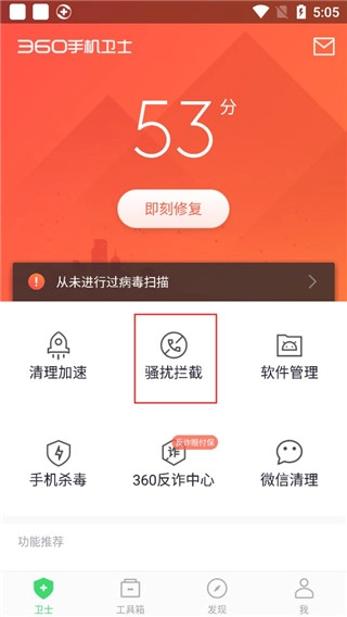 1、在主页里找到【骚扰拦截】功能,然后将其打开。