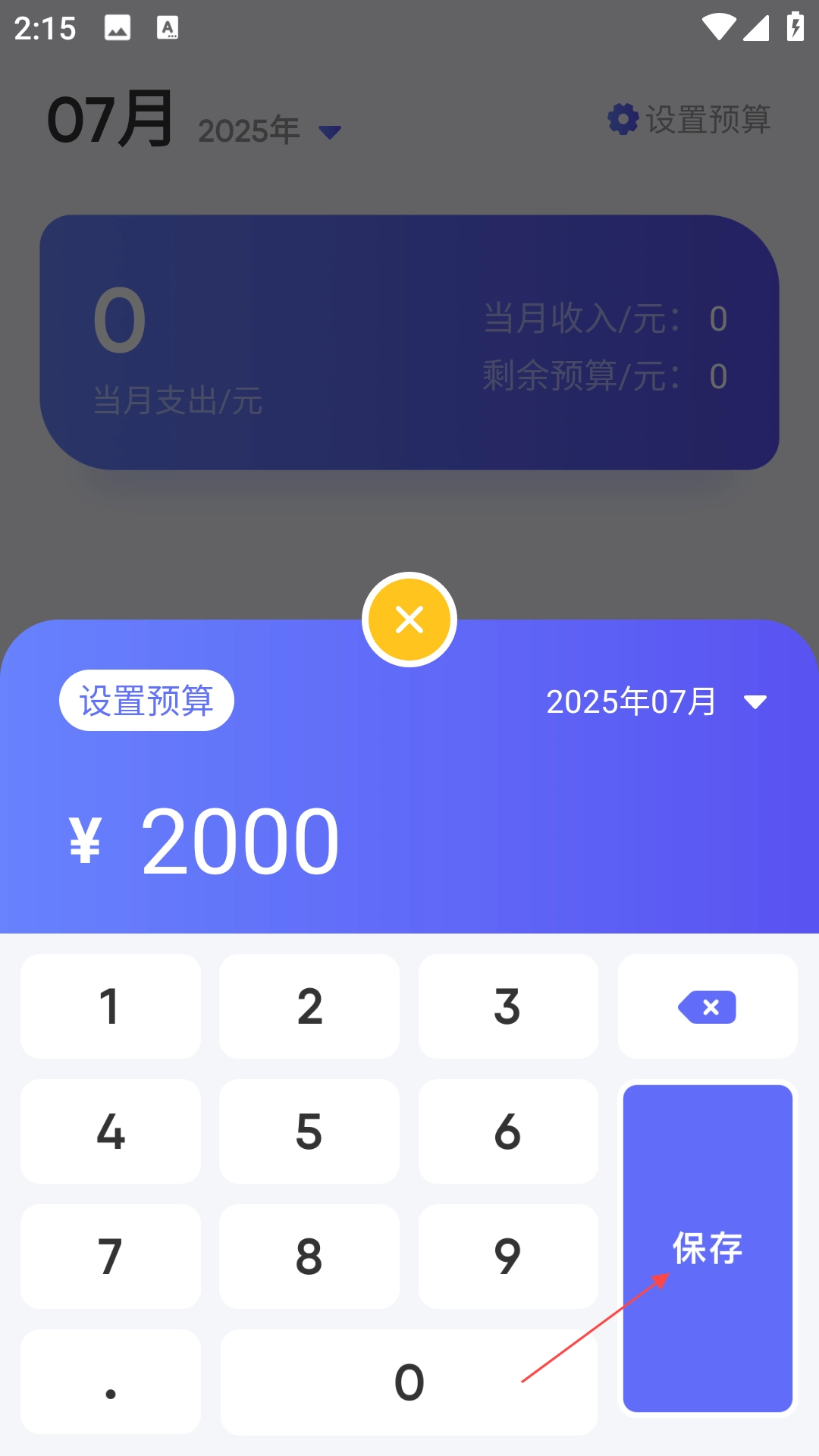 2、点击右上角【设置预算】图标,选择月份,输入金额,保存即可。