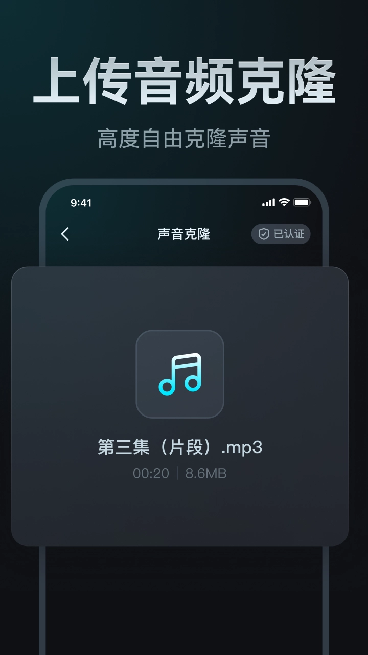 2.在App首页找到“声音克隆”功能,点击“上传”按钮,选择从手机本地导入声音样本,或直接录制一段音频