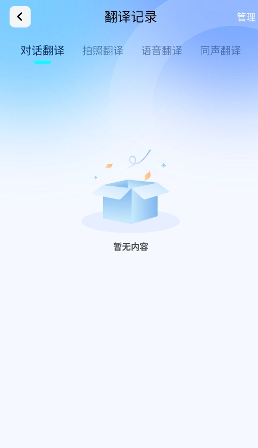 3.进入翻译历史页面,可查看过往的文本、语音、拍照及实时对话翻译记录