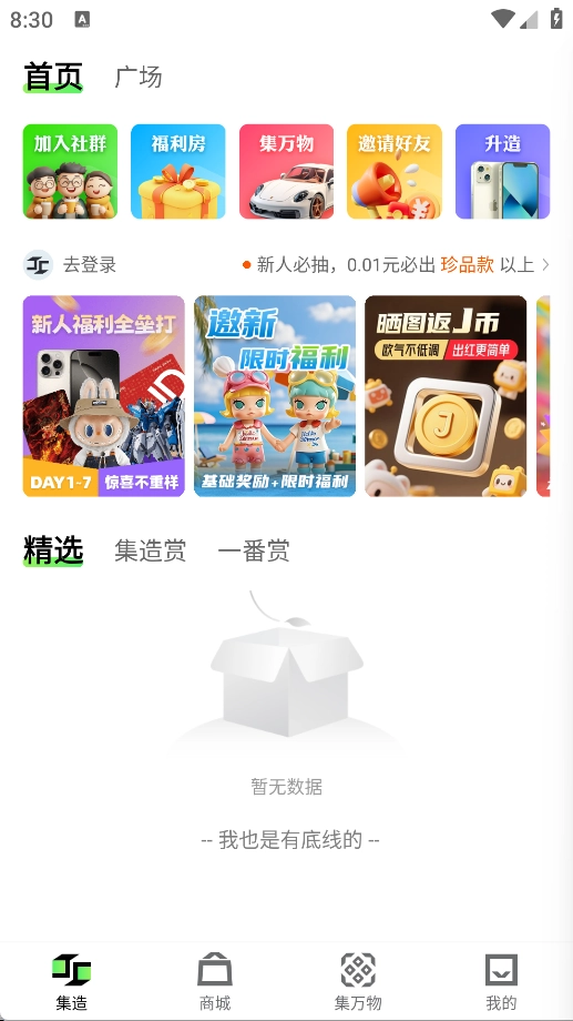 首页设有加入社群、福利房、集万物、邀请好友、升造等功能板块,此外还精心挑选了丰富多样的商品。