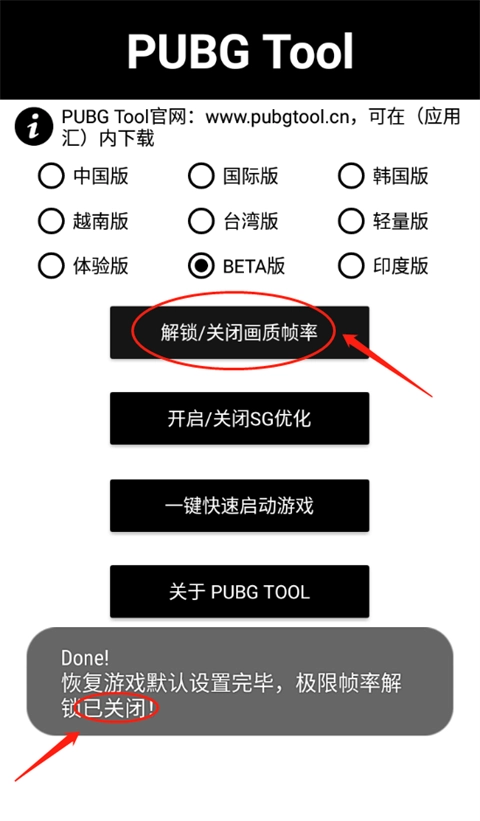 2、进入PUBGTool主界面,选择相对于的PUBG版本(PUBG国际服体验服所对于的是BETA版)。