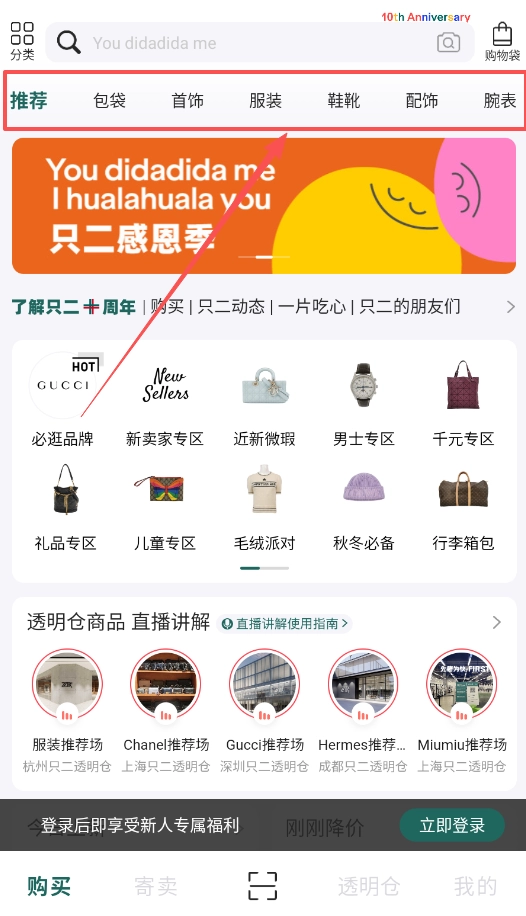 2、想买东西的话可以逛逛首页的必逛品牌区,有分男士专区、千元专区这些,底部随时能切换购买、寄卖、透明仓这些页面。