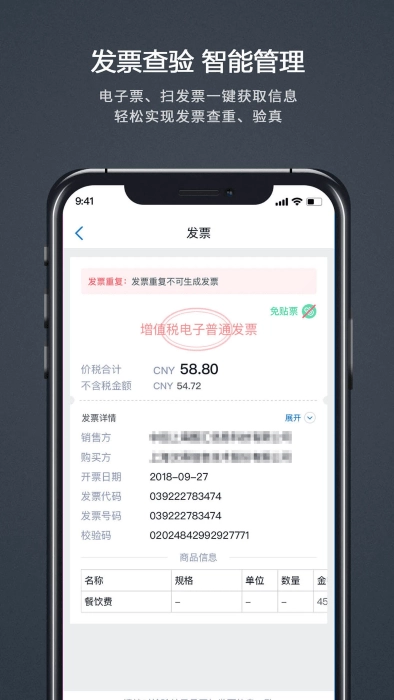 发票多形式智能管理:除手动填报发票信息,还可以进行一键扫描二维码,实现发票自动识别、查重、验真,更可以与微信、支付宝卡包及其他第三方应用,直接拉取电子票据信息,实现票据结构化整理,在线审核、统计。