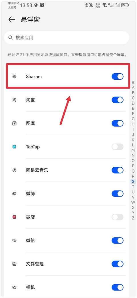 2、点击进入后找到Shazam软件,并将悬浮窗功能开启