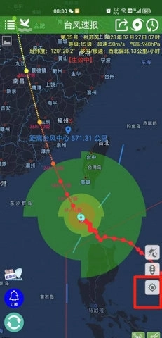 3、点击页面上的定位图标,即可查看到距离台风中心的位置