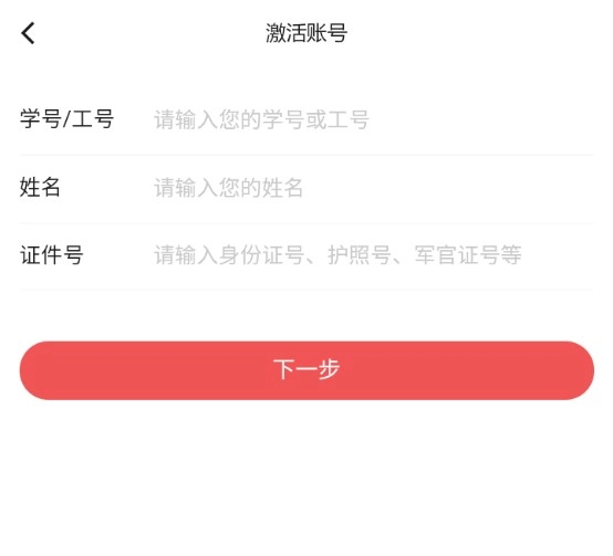 2.输入学号/工号、姓名、证件号点击下一步。教工信息与人事系统个人信息匹配;