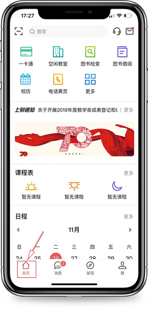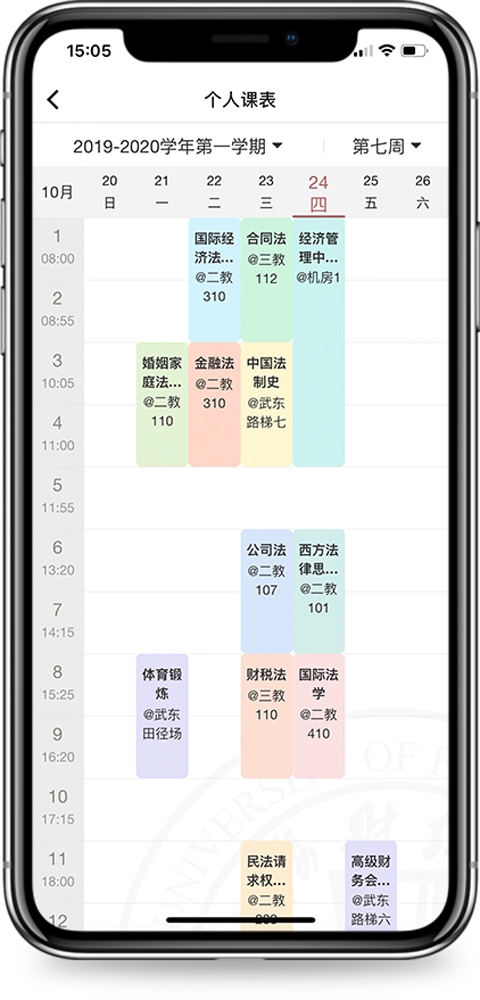 1、学生可以通过App查看当前学期的课程安排,包括上课时间、地点及授课教师信息等。