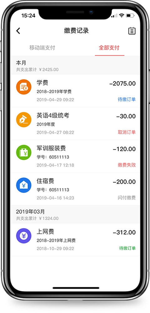 3、在生活通知界面还可以查看到学校中的各种缴费记录。