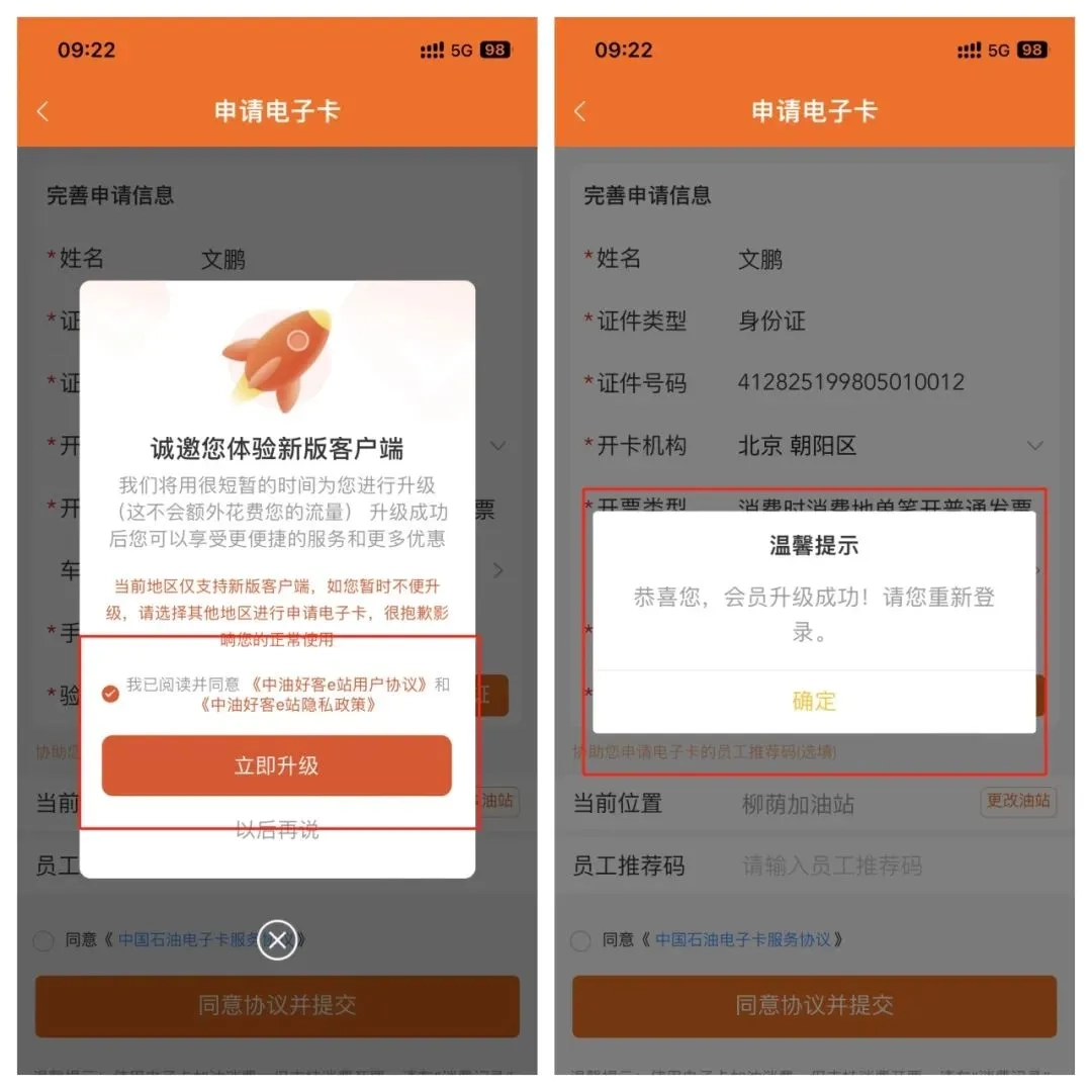 3.成功注册后,添加加油卡时系统自动触发升级到最新版本,随后重新登录;