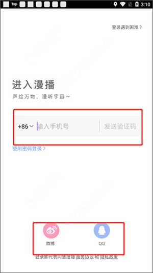 1、启动应用后,您可以通过手机号、微博、QQ这三种便捷方式完成账号登录。