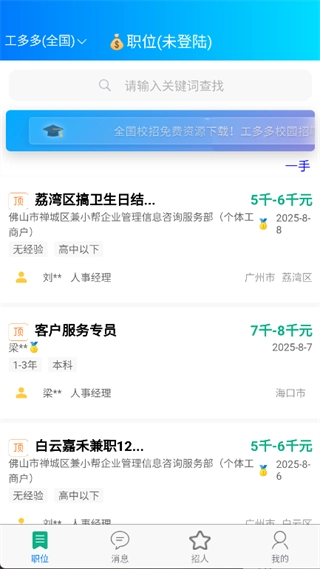 工多多是一款专注于求职招聘服务的软件,致力于为企业和求职者构建高效便捷的沟通平台。借助该软件,企业能够轻松发布各类职位招聘信息,吸引众多优秀人才;求职者可以上传个人简历,展现自身的专业技能与工作经验,从而获得企业人事的主动关注。除了支持个人求职和企业招聘外,它还为个人雇主和中介提供了高效的招聘渠道。