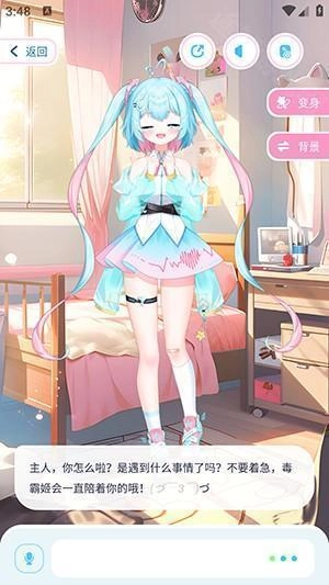 4、首页第一个角色就是毒霸姬,点击进去后,选择变身或者更换背景,也可以在输入框中输入内容进行互动。