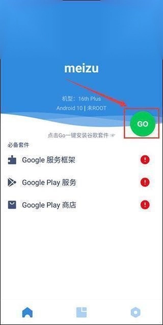 软件启动后会自动检测谷歌三件套的安装状态,若有未安装的套件,其后方会标注红色感叹号;此时用户只需点击右侧的绿色GO按钮,稍作等待就能完成安装。