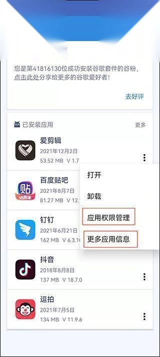 2、完成后需要用户自己手动安装,所以需要给予相应的权限,包括读取应用列表和允许安装未知应用等,安装完成后会显示谷歌套件已安装。