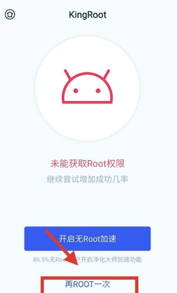 4、可能会出现root中途失败的情况。点击界面下方的“再Root一次”即可。若再次失败可重启手机重试
