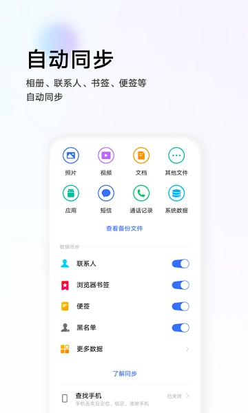 支持相册、通讯录、书签、笔记等自动同步。