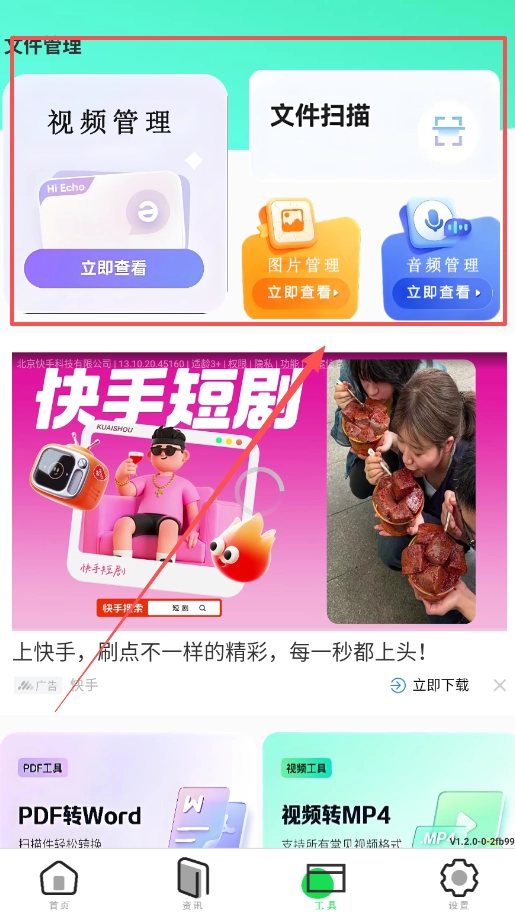 4、当需要转换文件格式,比如将PDF转为Word,在工具页找到对应功能即可操作,视频也能转为MP4格式。