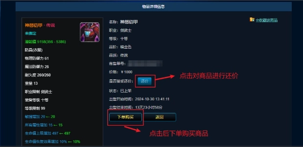 三、在装备详细信息页面点击 【下单购买】,则生成该物品的订单,进入支付页面。