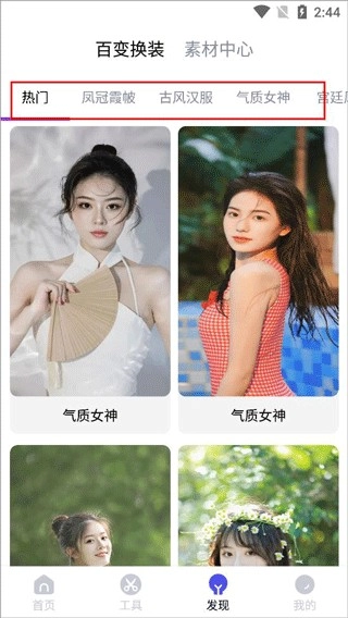 3、发现页面主要是素材中心和百变换装,可以素材添加到自己的视频中;