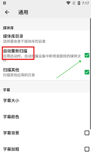 3、将【自动重新扫描】这一项打开即可,以后用户每次启用应用后都会自动将视频导入进来