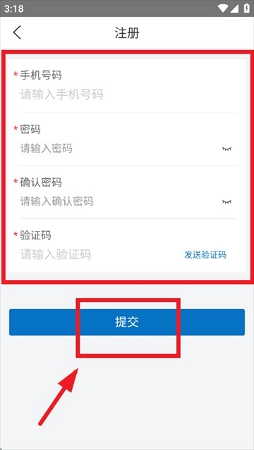 输入手机号,密码,验证码,点击提交即可