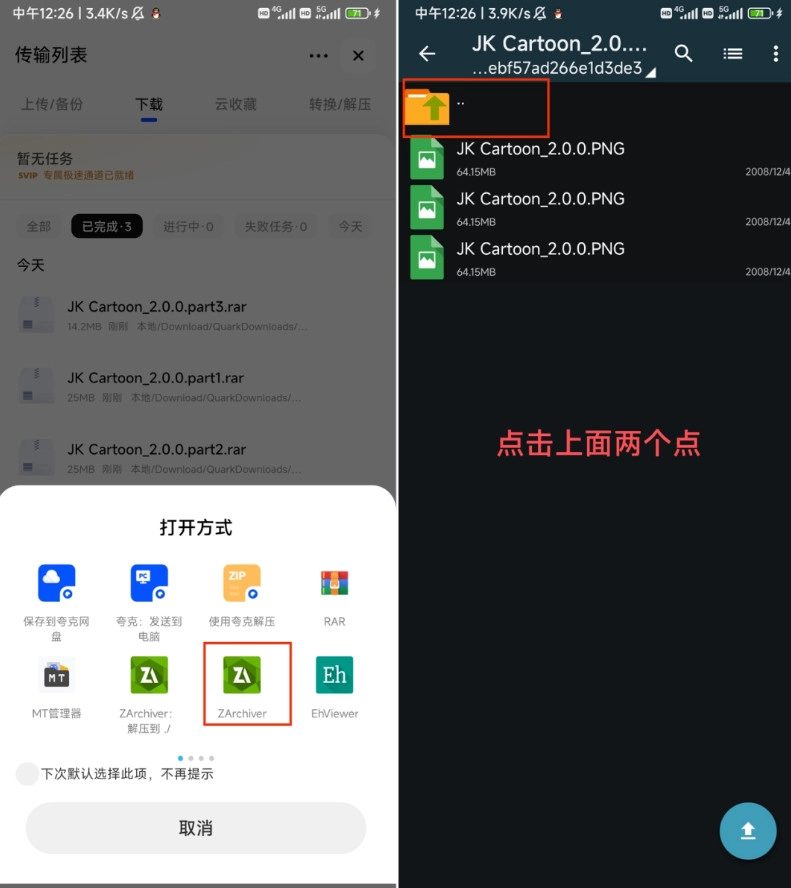 2.在打开方式中,选择用ZArchiver打开,然后点击上面2个点