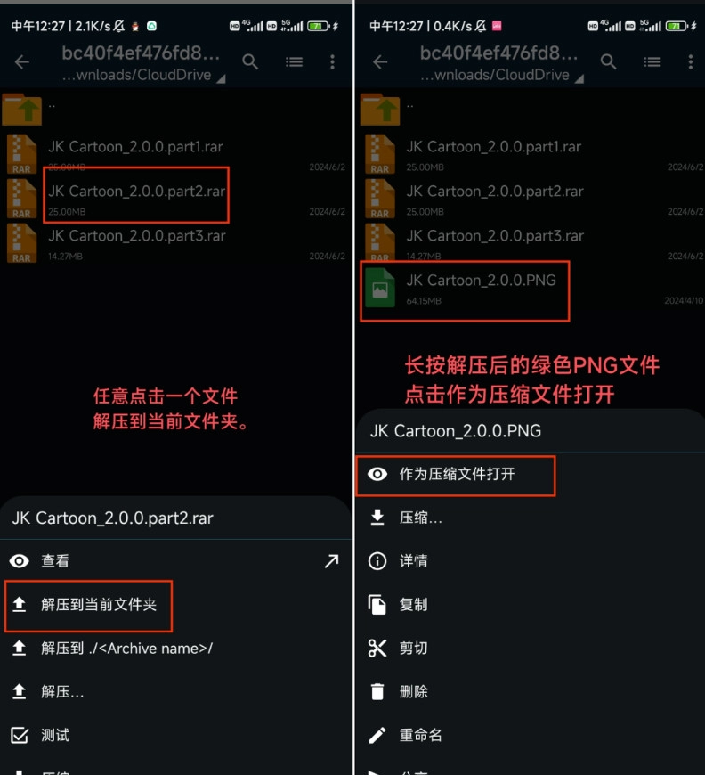 3.任意点击一个文件,选择解压到当前文件夹,然后长按解压后的绿色png文件,点击作为压缩文件打开