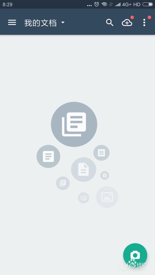 打开软件后是我的文档的界面,以前扫描的文件会在这里显示。另外右下角有个照相机的图标,这个图标就是扫描的图标,点击进入扫描界面。