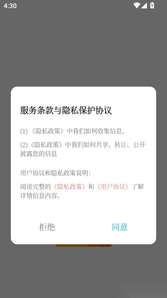 1.首先打开软件阅读条款和隐私协议后,点击“同意”按钮进入