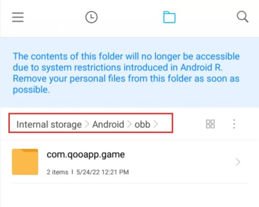 4)找到手机储存根目录/Android/obb 文件夹,创建和游戏包名“com.xxx.game”相同名字的文件夹