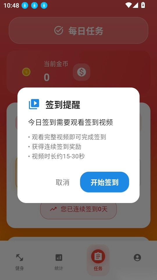 4、之后会出现广告弹窗的签到提醒,点击“开始签到”按钮进行下一步。