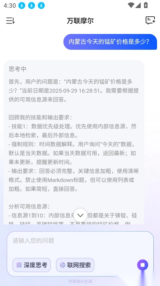 万联摩尔是一款功能强大的产业智能助手软件,海量行业数据资源,用户可一键获取高质量市场数据,实时掌握真实业务动态,轻松了解并随时查询各类产业数据;借助智能问答功能,还能就行业知识进行专业咨询,深入探索行业百科内容。平台支持实时查询企业信息,方便用户随心浏览、深度洞察企业详情;此外,万联摩尔最新版本新增价格趋势预测功能,可实时预判现货价格走向,预测精准且操作便捷,有需求的用户不妨即刻前往本站体验!