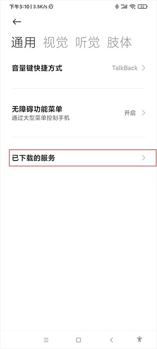 2、点击“辅助功能权限”后,找到“无障碍功能菜单”,是默认关闭的,需要开启;
