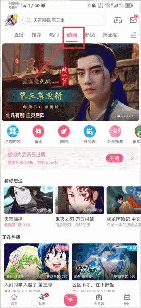1、打开哔哩哔哩动漫版,进入首页后点击动画界面,然后选择你想观看的动画。