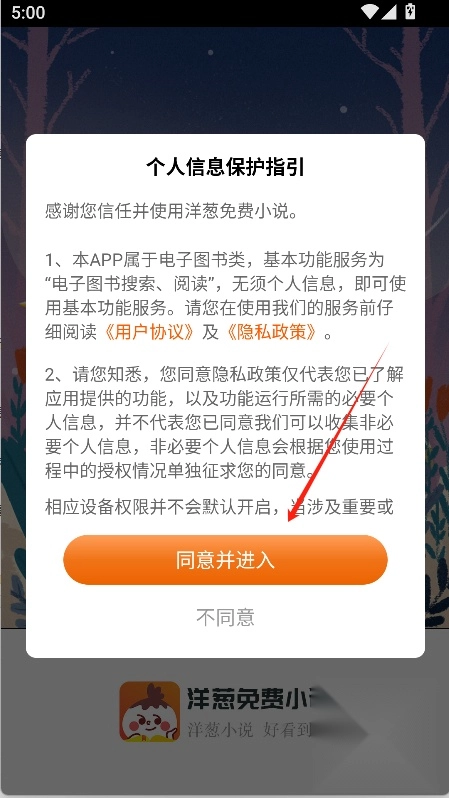 1、首先在魔趣网找到并安装洋葱免费小说应用,随后点击“同意并进入”按钮进入软件。