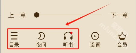 5、在设置界面你可以查看小说目录、切换章节、切换夜间模式、开始听书等