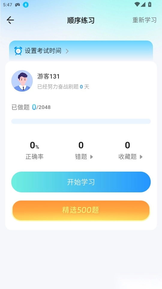 4.进入到顺序练题页面中点击“开始学习”即可获取试题刷题练习